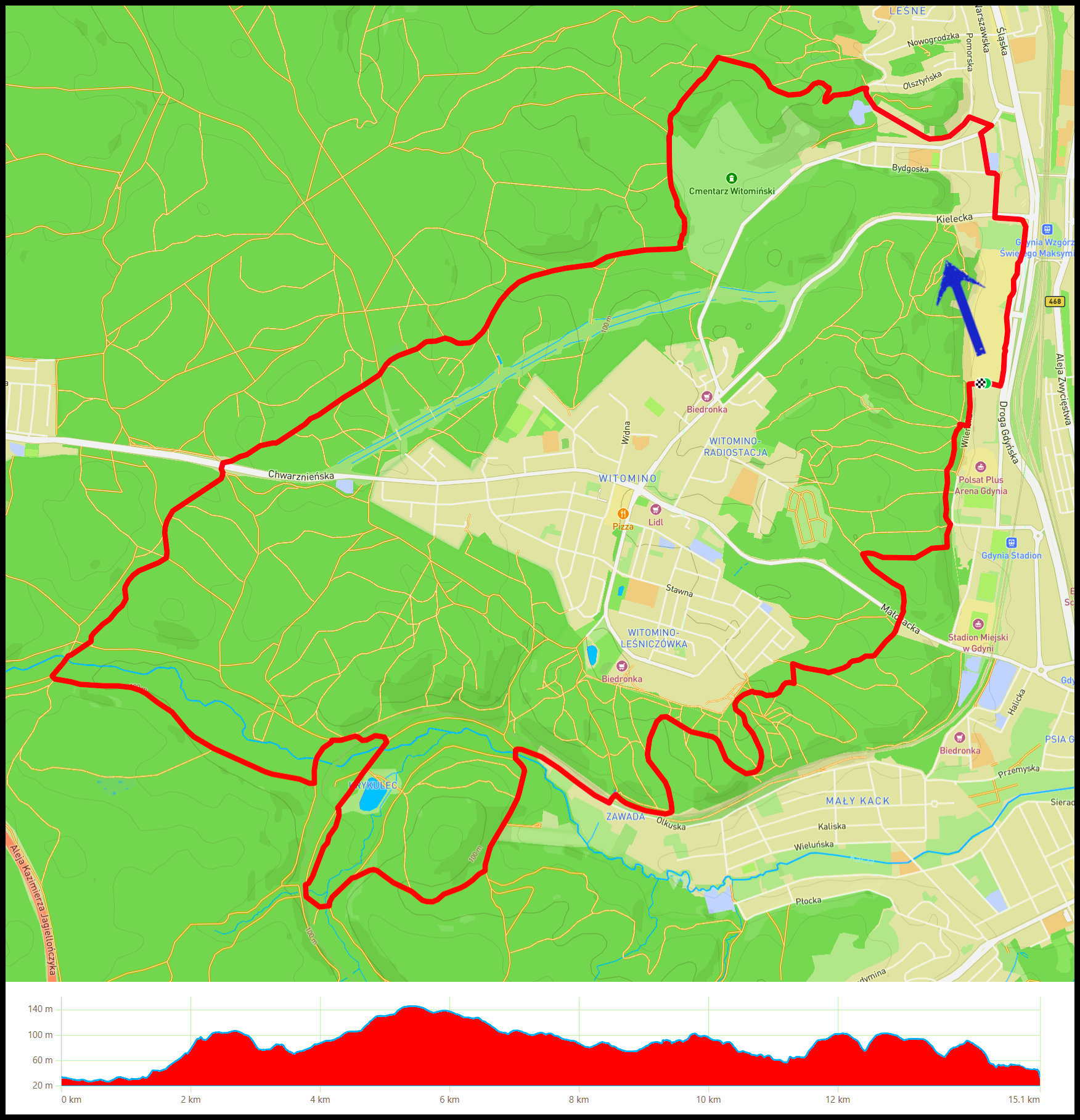 CH Riviera – Działki Leśne – Chwarznieńska – Krykulec – potok Źródło Marii – Witomino