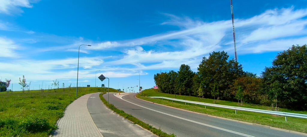 od Rdestowej mamy z lewej strony ładną ścieżkę (f.)– Chwaszczyno (na rodzie prosto – kiedyś DK 20 – f.)ponad 6km jazdę ruchliwą drogą kończymy zjazdem w A.Karwety (f.)gładkie, fajne drogi wzdłuż OMT (filmik czas 2’43”)